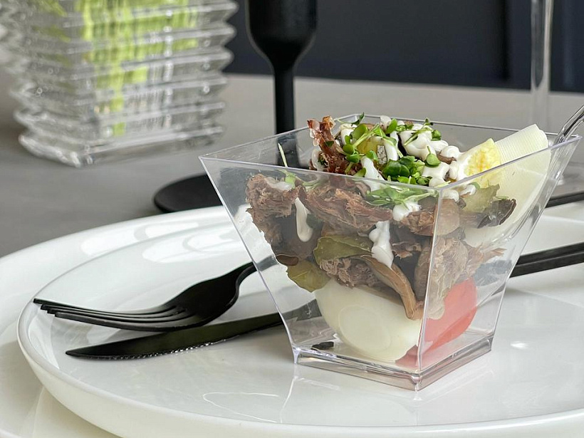 2. Салат с говяжьим языком, шампиньонами, яйцом, черри и маринованными огурцами